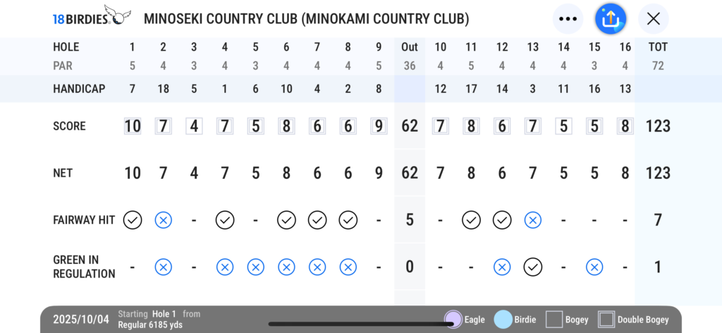 今日は、メイン機で18BIRDIESが起動しないので、iPhoneのサブ機で、AppleWatchと連動しない手動のクラッシックトラッキングという従来型の方法で一打ごとの位置情報や飛距離をトラックしようとしたが、雨でiPhoneの出し入れが煩雑なのと、濡れて画面の反応ができないなどもあって、Play Fastに追われてあまり記録できなかった。はやりAppleWatchでの手元だけでの操作が必須と感じた。
