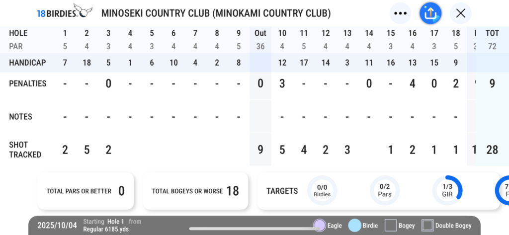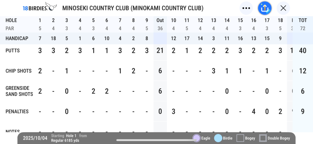 - 3パットは何回か出ている(特に前半21パット)。ライン読み+距離感が課題。
