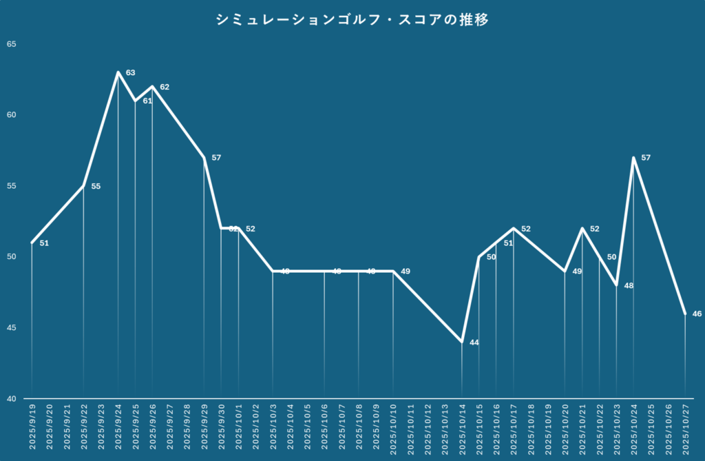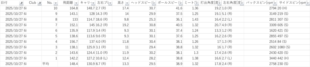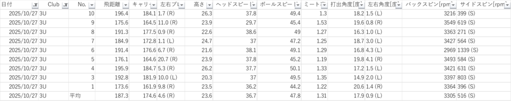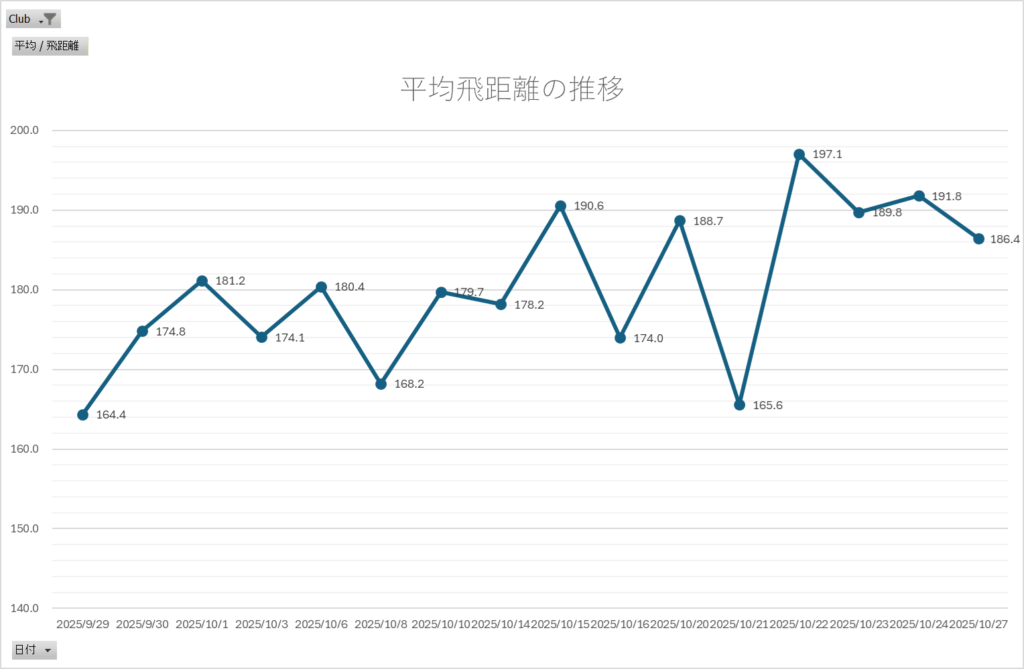 継続的に飛距離を伸ばしてより有利にグリーンに乗せるためにドライバー、ユーティリティーの中でも最も長い3番ユーティリティー、アイアンの中でも最も長い6Iをそれぞれ10球打った平均を長期間トラッキングし、飛距離と安定性を伸ばす練習。ヘッドスピードが3