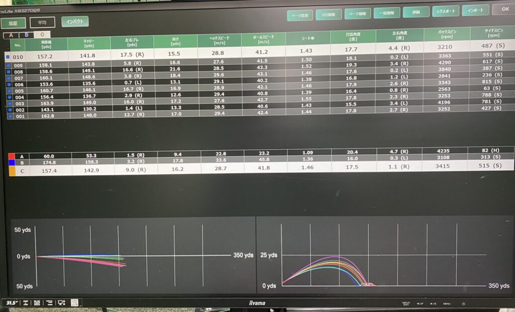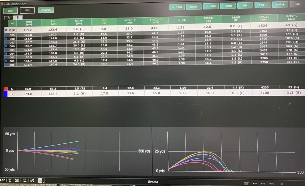 シミュレーションコースを終えて、1W、3Uをそれぞれ10球程度フルスイングしてショットログをとる。