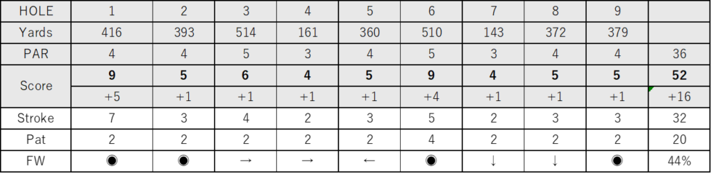 ウォーミングアップ後、シミュレーションゴルフでコースAのアウトコースにチャレンジし、+16の52。